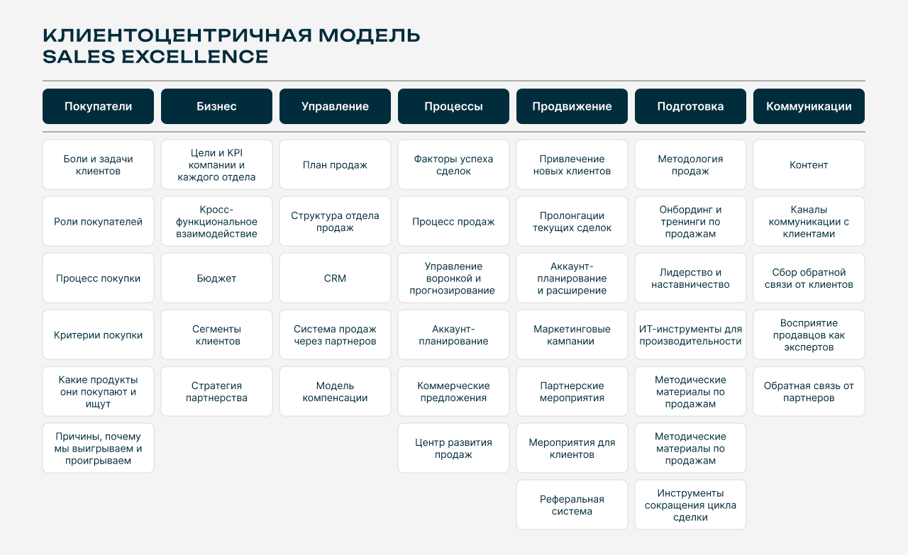 Sales Excellence — это концепция непрерывного совершенствования всех компонентов системы продаж: процессов, инструментов, навыков, взаимодействия между отделами. Такой подход позволяет собирать лучшие практики, масштабировать их на всю организацию и повышать эффективность сотрудников.