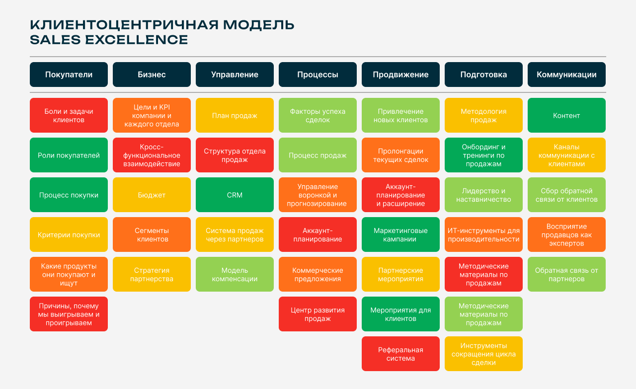 Подход Sales Excellence охватывает десятки аспектов — от стратегии и целей до контента и инструментов сокращения цикла сделки. Но именно эта широта и мешает начать: сложно сразу определить, где основные узкие места, что требует внимания в первую очередь, а где уже всё неплохо работает.